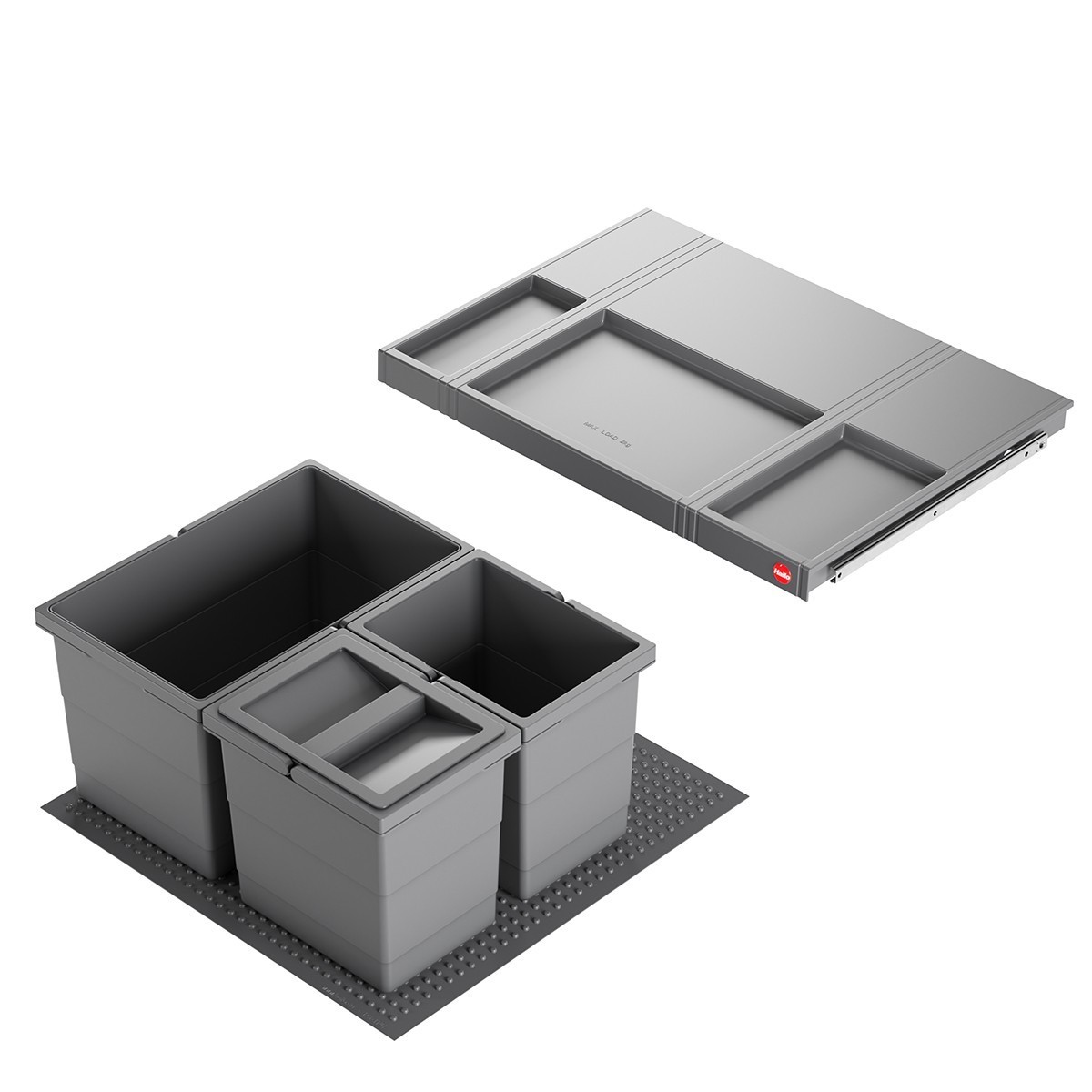 Afvalsysteem voor op de ladebodem met speciale antislip noppenmat waardoor de emmers op hun plaats blijven staan.