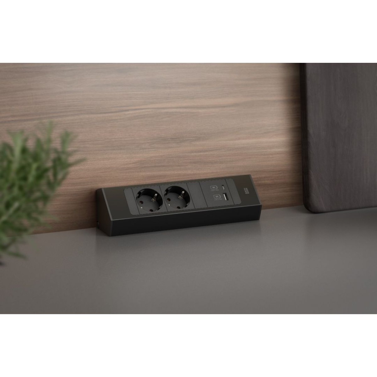 Casia 2 Hoekstopcontact USB A/C kort met Belgische aarding in de kleur zwart. Voor plaatsing onder een bovenkast of op het blad. Kan zowel horizontaal als verticaal geplaatst worden.