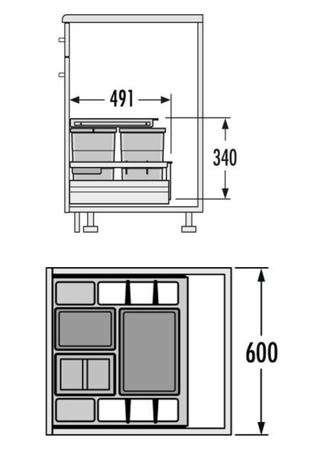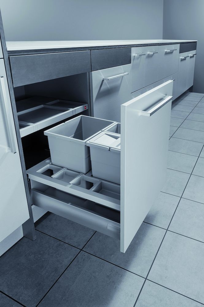Met uitschuifbaar multi-functie kunststof deksel. De 2 x 8 liter emmers zijn ook te vervangen voor een extra 18 liter emmer. Hoogte binnenemmers: 295 mm. Onder andere geschikt voor: Blum Legrabox, Grass Vionaro en Hettich ArchTech ladesystemen.