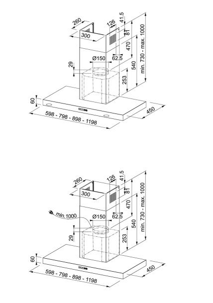 Wanddampkap, volledig afgewerkt in inox of zwart . 3 snelheden + intensief. Voorzien van 2 ledspots 1W.