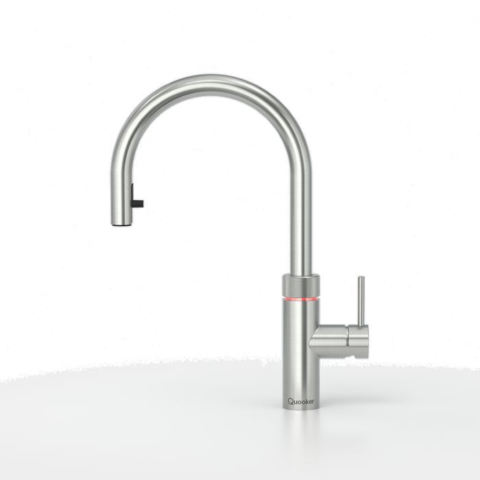 Inclusief Flex alles uit één keukenkraan met uittrekbaar perlatordeel, hendel voor warm en koud water en geïntegreerde druk-draai bedieningsknop voor bruisend, gefilterd en kokend water met Led-indicatie. De Cube boiler is voorzien van display voor het instellen en het aflezen van de bruis capaciteit.
